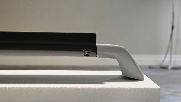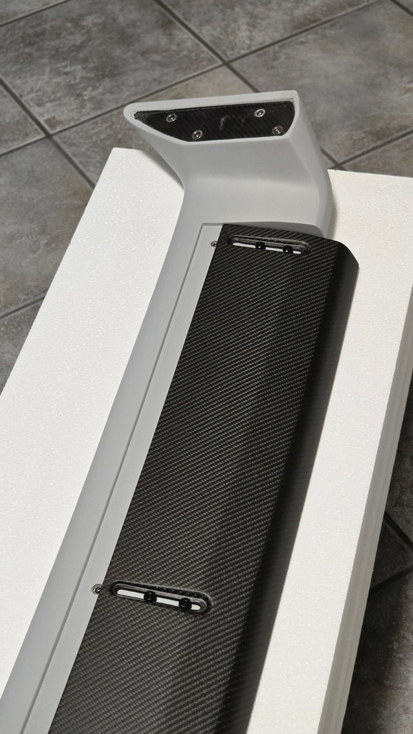 There are two mounting methods for the the flap. The 'home' position offers a subtle and sleek look, with the flap sitting flush with the bottom of the wing. The trailing edge just peaking above the rear of the wing. The 'performance' mode increases the rake angle of the flap, and allows for ~30mm of extension adjustment for that touring car look. All adjustments are easily made with a 4mm hex.